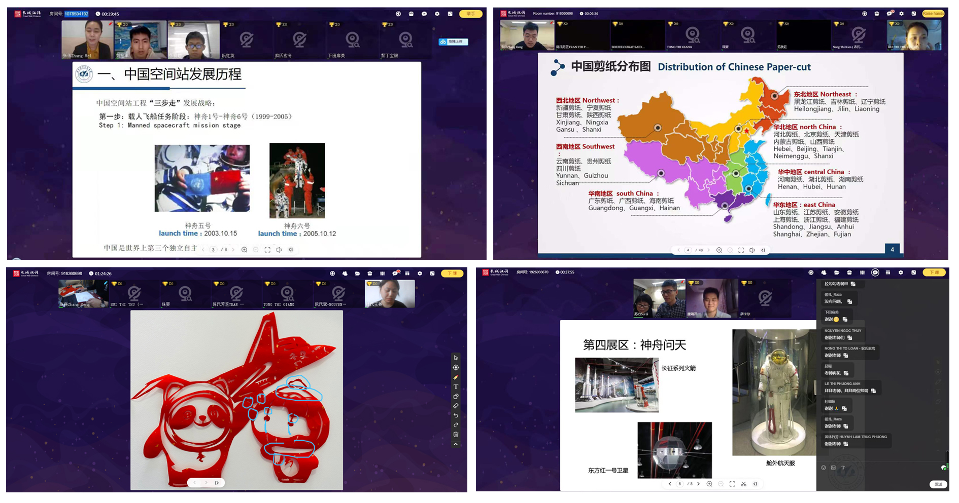 在为期8天的时间里,该项目以“飞翔汉语·点亮梦想”为主线,精心设计了系列教学与实践活动。在学习汉语、交流中国文化的同时,还邀请了来自我校航空学院、宇航学院、生物医学工程学院的专家教授带领学生“云参观”航空航天博物馆、讲授“月宫一号”空间基地生命保障人工闭合生态系统地基综合实验项目、讲解小卫星研发的意义和“北航亚太一号”小卫星研制过程,并邀请中国空间技术研究院的研究员对中国空间站和航天员的太空生活进行了深入浅出的讲解。