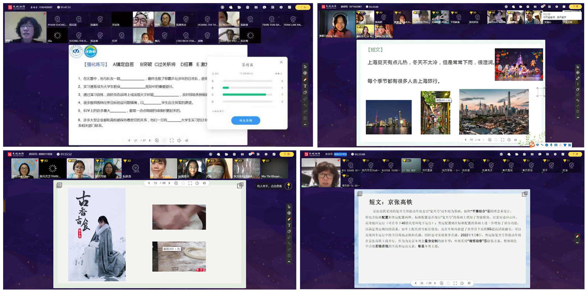 本次线上团组交流项目在每堂课安排了交流互动环节,同时在教学与互动中融入了“申请冬奥会志愿者时怎样介绍自己”“舌尖上的中国空间站”“十二道航味”“北航定点帮扶县中阳县副县长直播带货”“北京环球影城一日攻略”“奥运版复兴号智能动车组在京张高铁上线开行”等一系列中国、北京、北航的热点和时事,让项目学员学习汉语的同时,更加深入地理解在减贫、科技创新、全球合作领域的“中国智慧与中国方案”。