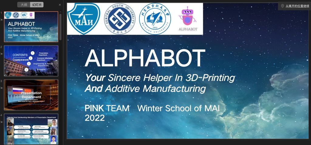 莫航增材制造部门主任维莱明·布雷金——他也是增材制造与3D打印课程的主讲人——向各学员小组介绍了分配的任务。本次课程的任务是小组合作完成一个利用增材制造技术生产的机器人的设计、市场分析与功能展示,并最终以小组展示的形式体现出来。各小组以不同的颜色为标记。我所在的粉色小组是北航和中南大学学生的联合团队,分配到的任务是3D打印生产车间的操作机器人的设计。我负责牵头整个小组的幻灯片制作和小组展示。在各位同学的通力协作之下,我们小组的成果受到了俄方教师与学生团队的高度肯定,最终被授予了最佳小组的荣誉。