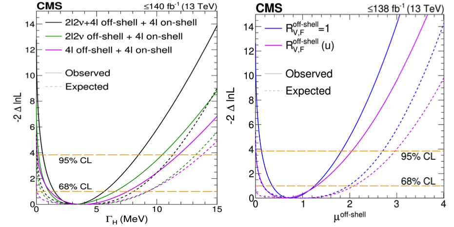 左图: 实验上观测到的希格斯粒子宽度的似然值扫描结果。 右图: 实验上观测到的希格斯粒子离壳事例信号强度的似然值扫描结果。