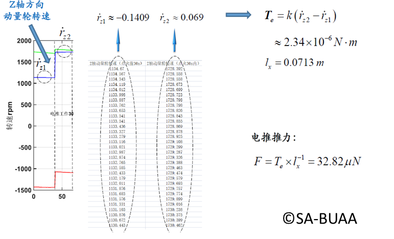 自2022年5月17日首次点火以来,ILT-50离子液体电喷雾推进系统进行了多组持续的点火工作及推力在轨功能试验。遥测数据表明,卫星动量轮转速发生了明显的变化。通过对比点火前后卫星动量轮转速变化数据,得到离子液体电喷雾推力器在-5至-10℃条件下的推力为32.8μN,这与2022年10月18日和2023年2月25日两轮次点火的数据和项目团队前期在地面使用微推力架测得的推力数据一致。这也是离子液体电喷雾推进系统首次公开报道的在轨推力数据。