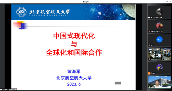 为扎实开展主题教育,从习近平新时代中国特色社会主义思想中汲取奋发进取的智慧和力量,6月9日晚,学校党委常委、副校长黄海军以《中国式现代化与全球化国际合作》为题讲授主题教育专题党课。国际交流合作部部长翁敬农主持。