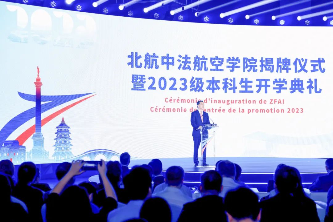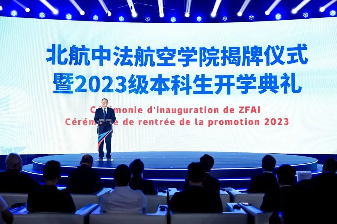 他指出,五年多来,中法两校携手共进,吸收融合法国卓越工程师教育理念和模式,充分依托北航空天信学科融合特色和发展优势,稳步推动新机制的国际化合作办学,一个承载着高水平国际卓越工程师培养愿景的校园已在余杭拔地而起。在这座现代、大气、美丽、智慧的国际化校园,同学们青春洋溢、朝气蓬勃,令人感到欣慰又充满力量。大家将在“浙”里收获中、法、英多语种教学的课程新套餐,体会本硕贯通和法国“预科-工程师”相结合的培养新模式,在国际知名学术大师的指导下收获新成长。未来充满希望、大有可为。