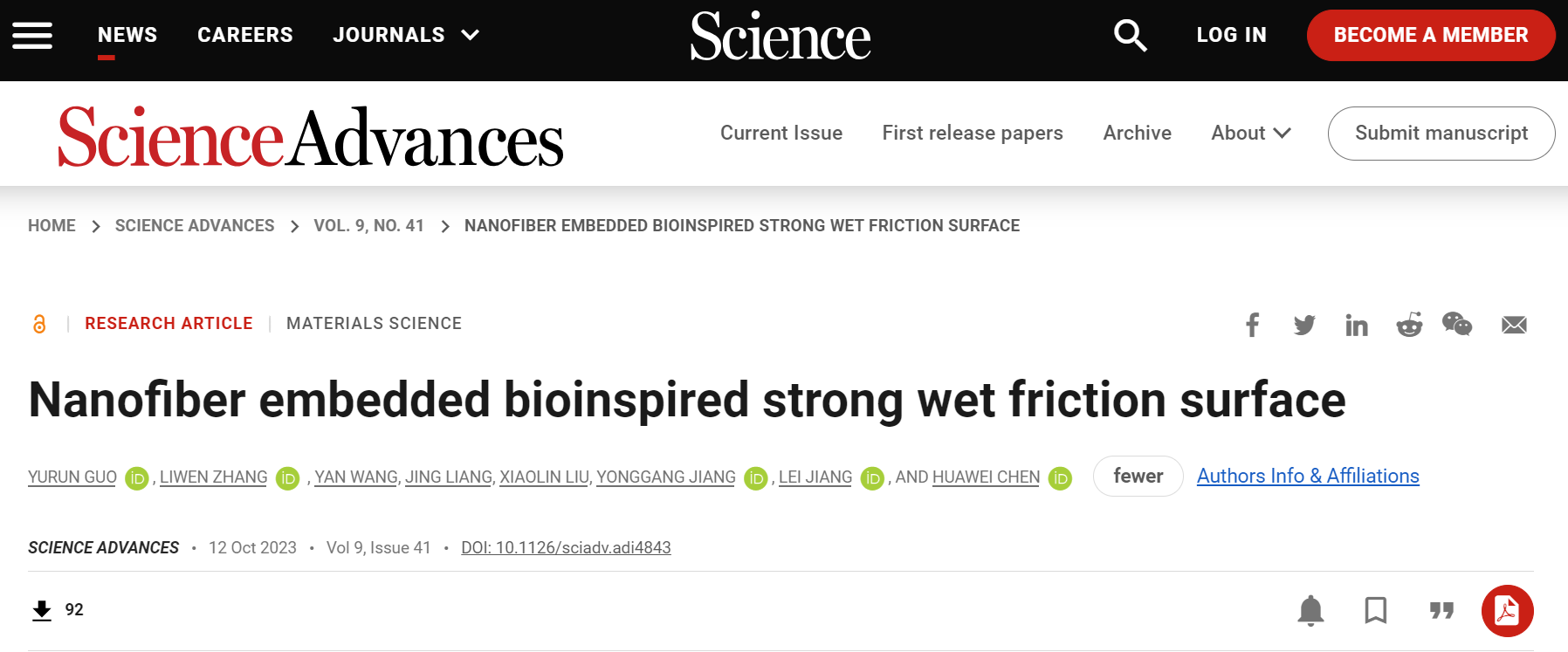 2023年10月13日,《Science》子刊《Science Advances》刊发机械学院陈华伟教授课题组仿生湿摩擦机制新发现,论文题为“Nanofiber embedded bioinspired strong wet friction surface”,陈华伟、张力文为通讯作者,博士生郭雨润为第一作者。