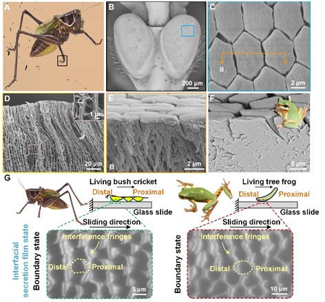 螽斯科的昆虫蝈蝈具有比树蛙更为优异的湿攀爬能力,与树蛙脚垫实心棱柱结构相比,蝈蝈脚垫光滑表面下分布着竖直的纳米纤维毛阵列(图1A-F),其边界摩擦性能超树蛙脚垫近4倍。界面液膜动态原位表征发现,蝈蝈脚垫纳米液膜分离发生于近身体侧(Proximal),而树蛙脚垫液膜分离出现在远身体侧(Distal),呈现出截然不同的界面液膜分离模式(图1G),经揭示这种相反的界面液膜动态行为是蝈蝈优异边界湿摩擦的重要原因。