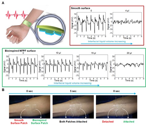 图5 仿生强湿摩擦表面在柔性传感贴片上的应用及其湿粘附性能