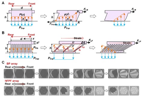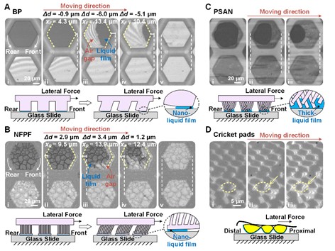 为揭示湿摩擦增强的机理,进一步详细表征了摩擦过程中棱柱形变和界面液膜运动。BP棱柱在底部摩擦力和顶部横向拉力的剪切作用下,棱柱前侧受到明显的挤压应力(图3A),棱柱直径变小,棱柱后侧与基底发生分离。而NFPF棱柱由于其纳米纤毛可以轻易侧向变形,在剪切作用下通过弯曲变形极大的降低了界面分离应力,并将分离区域转移至棱柱前侧,受此影响出现了棱柱直径增大的现象。在PSAN棱柱的粗糙表面,由于厚液膜毛细力极低,在运动中流动至棱柱后侧,棱柱未出现明显的变形,摩擦力几乎为零(图3C)。