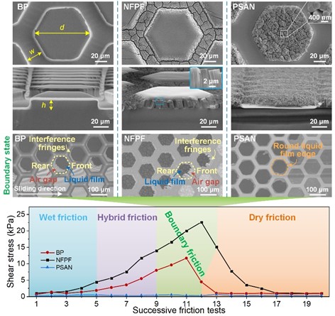 受此启发,研究团队设计制造出不同的棱柱结构表面:仿树蛙实心棱柱结构(BP)、仿蝈蝈纳米纤维支撑薄膜棱柱结构(NFPF)。原位表征界面液膜行为也进一步证实了BP棱柱、NFPF棱柱表面在剪切作用下与基底分离位置发生了转移,由BP棱柱后侧(Rear)分离改变为NFPF棱柱前侧(Front)分离,与树蛙和蝈蝈脚垫的不同液膜分离方式一致,同时NFPF边界摩擦达到BP的两倍(图2)。