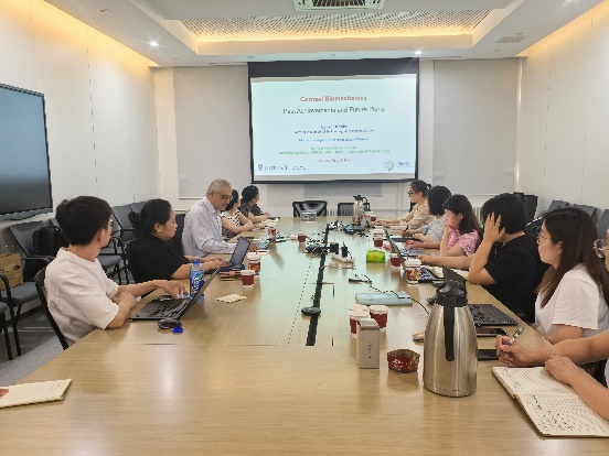 会后,Ahmed Elsheikh教授为生物力学与力生物学教育部实验室师生做了题为Corneal Biomechanics的报告,详细介绍了生物力学自上世纪90年代以来的发展历程及未来趋势,为青年学者们提出了热点方向,他强调了生物力学在临床应用方面的重要作用及广阔前景,展示了他本人基于生物力学原理开发的眼科在体检测装备,可有效降低临床费用。报告吸引了医工学科群从事眼生物力学研究的老师和同学们,与会老师同学与Elsheikh教授进行了深入的讨论,并探讨了后续的合作方向。