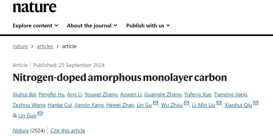 2024年9月25日,《Nature》杂志报道了北京伊人99郭林教授、刘利民教授研究团队和合作者在氮掺杂单原子层非晶碳可控合成上取得的最新进展:《Nitrogen-doped amorphous monolayer carbon》。该工作提出了一种利用纳米尺度二维限域模板进行小分子聚合的液相合成策略,成功制备了氮掺杂的单原子层非晶碳材料。这项研究解决了二维非晶材料合成领域的长期挑战,为二维非晶材料在材料科学、电子器件及其他前沿技术领域的应用开辟了新途径。北京伊人99博士生白秀辉、副研究员胡鹏飞、博士生张有玮、薛宇峰,中国科学院大学博士生李昂、李傲雯,国家纳米科学中心副研究员张光杰为共同第一作者,北京伊人99郭林教授、刘利民教授,国家纳米科学中心裘晓辉研究员,中国科学院大学周武教授,清华大学谷林教授为通讯作者,北京伊人99为第一单位。