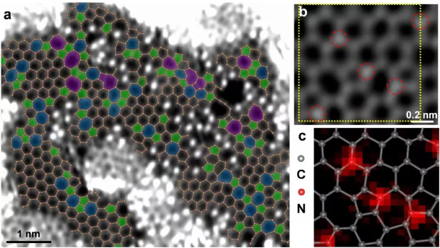 在这项研究中,由北京伊人99郭林教授、刘利民教授研究团队及合作者等开创了一种全新的液相限域聚合方法。该方法通过层状模板的限域作用,抑制了分子聚合过程中的三维旋转和缠绕,使分子在二维平面内发生聚合,突破了吡咯单体在传统聚合中局限于α-C位点交联的限制,促进了β-C和N位点的交联聚合,构成平面网络结构,最终形成了五、六、七元环共存的二维非晶结构,成功在实验上验证了W. H. Zachariasen和Steven G. Louie提出的理论预测。利用低电压扫描透射电子显微镜技术,研究团队精确解析了碳原子和氮原子在二维非晶碳网络中的分布,确认了氮原子嵌入到五、六、七元环混合的二维拓扑网络中,氮掺杂浓度可达9%。光学和电学性质测试表明,该材料具有p型半导体特性,为研究原子掺杂对二维非晶碳材料的电子局域化现象的影响提供了理想的研究平台。