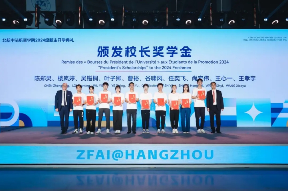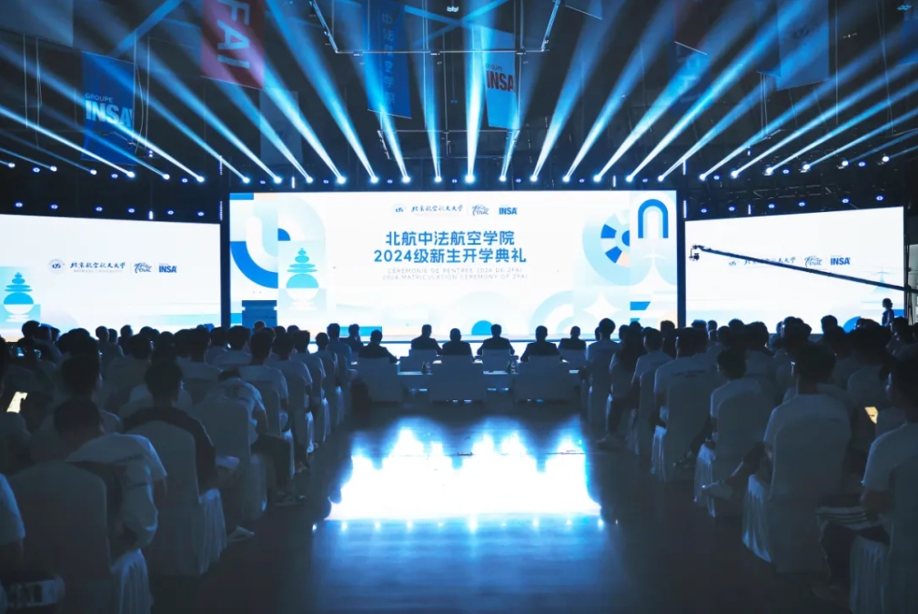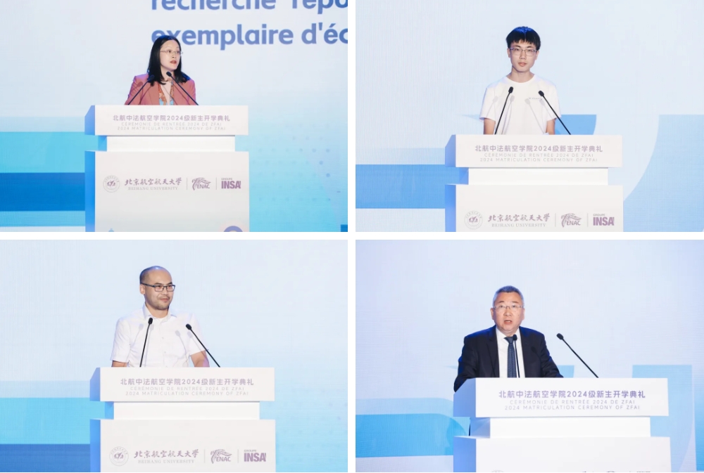 9月24日上午,北航中法航空学院2024级新生开学典礼在北航杭州国际校园科教美育中心举行。北航校长王云鹏、法国驻上海总领事馆文化教育处教育领事戴杰明(Benjamin DEMIÈRE)、法国国立民航大学(ENAC)校长奥利维耶·尚苏(Olivier CHANSOU)、法国图卢兹国立应用科学学院(INSA Toulouse)校长贝尔唐·哈盖(Bertrand RAQUET)、浙江省教育厅国际合作与交流处处长蓝晶晶等出席典礼。仪式由北航中法航空学院中方院长洪冠新和法方院长让帝(Frédéric Genty)共同主持。