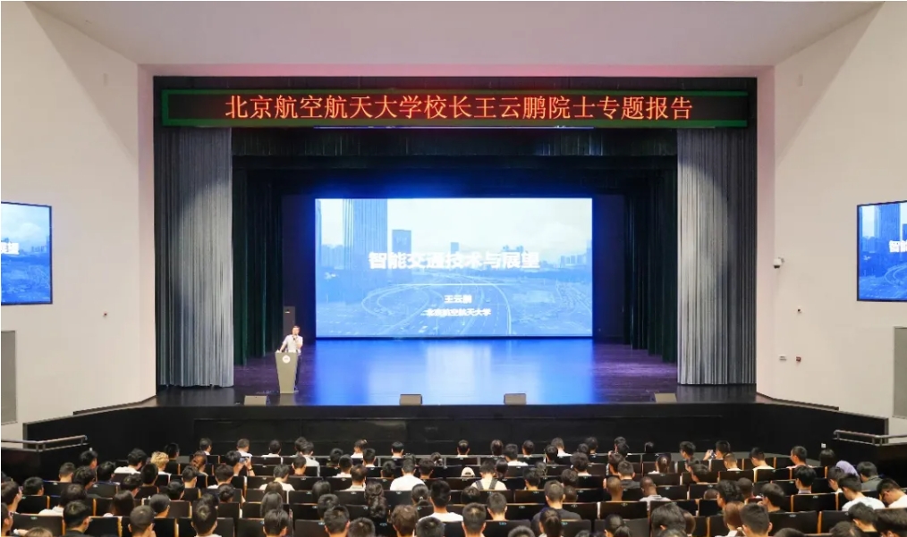 在杭州国际校园期间,王云鹏还专程为杭州北航国际创新研究院(学院)、北航中法航空学院、北航杭州创新研究院、北航大科学装置研究院、天目山实验室等近千名在杭本研学生带来了题为《智能交通技术与展望》的专题报告,与同学们分享了自己对智能交通领域的感受和体验。报告会场座无虚席,气氛热烈。