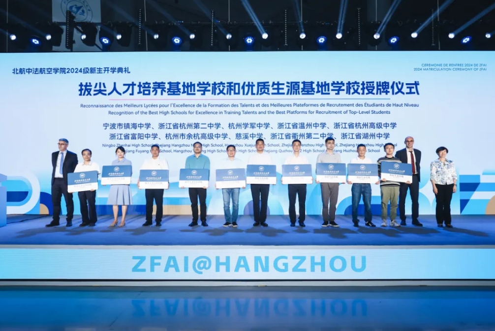 北航副校长张海兰、ENAC副校长尼古拉·卡扎利斯(Nicolas CAZALIS)、法国里昂国立应用科学学院(INSA Lyon)副校长达米安·法布雷格(Damien FABRÈGUE)共同为拔尖人才培养基地学校和优质生源基地学校授牌