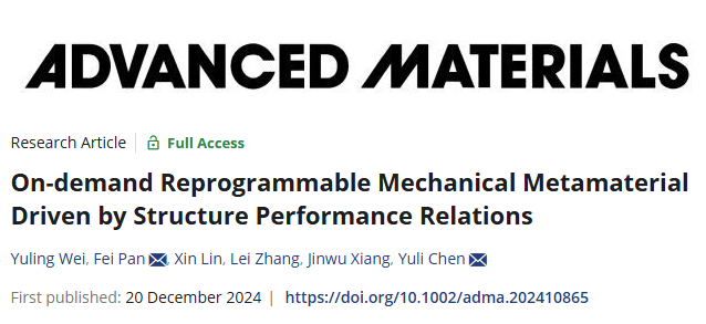 近日,《Advanced Materials》(先进材料)发表了我校航空学院潘飞副教授、陈玉丽教授与向锦武院士合作完成的研究成果“On-demand Reprogrammable Mechanical Metamaterial Driven by Structure Performance Relations”(构-性关联驱动的按需重编程力学超材料)。该工作利用“结构-驱动-调控”一体化的设计策略,实现了超材料力学性能的自动按需重定制,为迈向“物理智能+数字智能”融合的自适应人工智能系统提供了新的思路。该工作入选期刊“Editor’s Choice”,被特别推荐。航空学院博士生魏玉领是论文第一作者,潘飞副教授、陈玉丽教授是共同通讯作者。北京伊人99为第一单位。