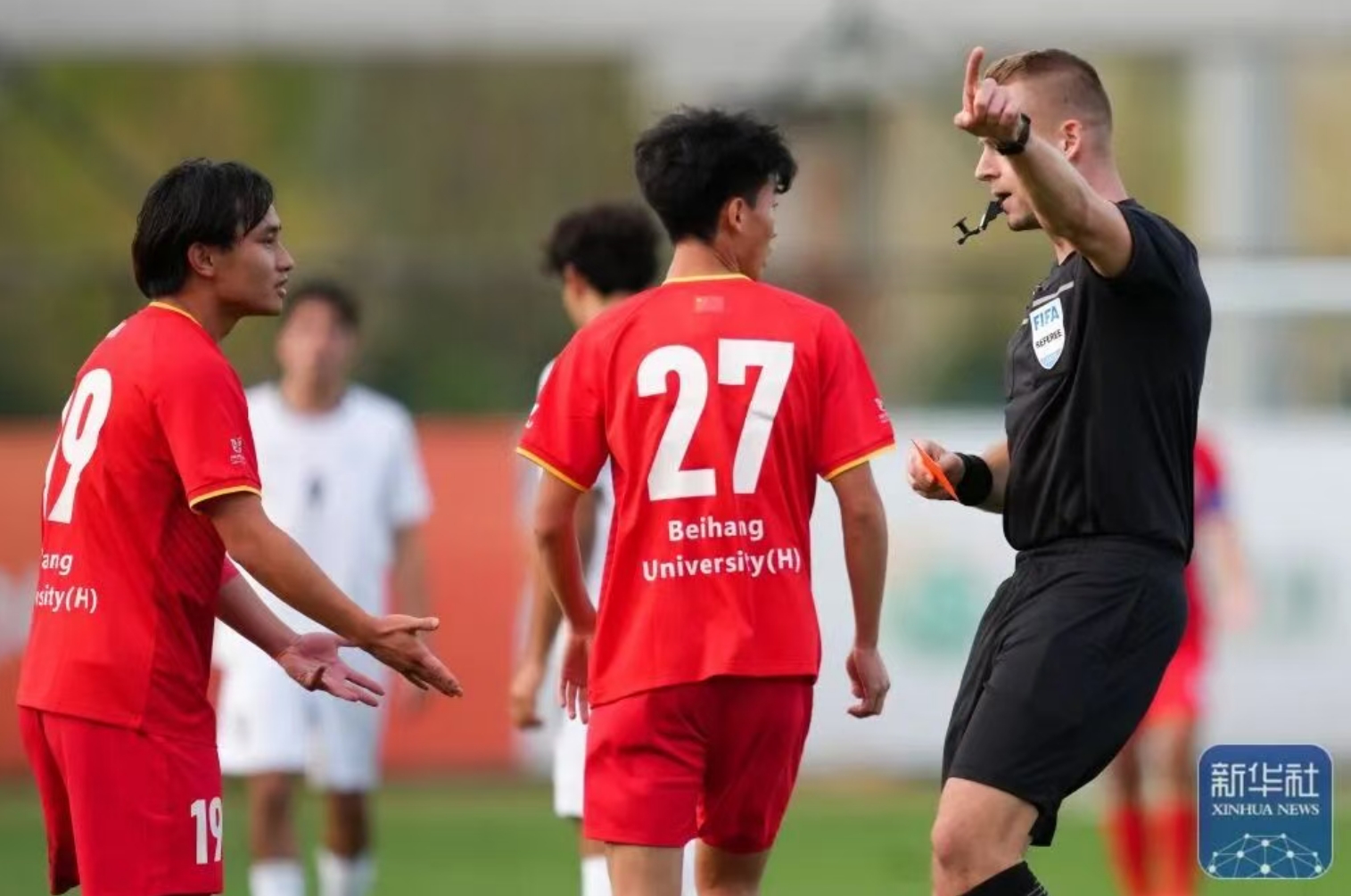 主裁判向北京伊人99男足球员林扬(左)出示红牌。