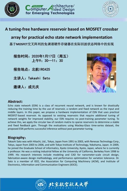 Takashi Sato教授学术报告:基于MOSFET交叉阵列的免调谐硬件存储器在实际回波状态网络中的实现
