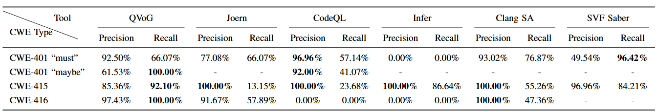 在Juliet测试集上,QVoG与Joern, CodeQL, Infer等多种工具进行了对比。结果显示,QVoG在多个CWE类别上表现优异。例如,在CWE-415(Double Free)上,其召回率达到92.10%,远超其他工具。在CWE-416(Use-After-Free)上,QVoG在高达97.43%的精度下,实现了100%的召回率。