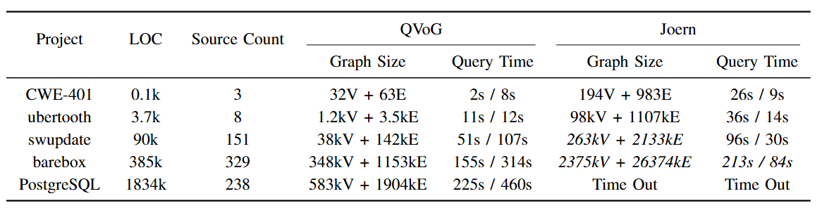将QVoG与主流工具Joern进行比较后发现,在图规模上,QVoG展现出巨大优势。例如在barebox项目(385k行代码)上,QVoG的图大小仅为Joern的约七分之一。在处理PostgreSQL项目(1834k行代码)时,Joern因超时而失败,而QVoG成功完成分析。在查询速度方面,QVoG的CPU时间比Joern快至少三分之一。